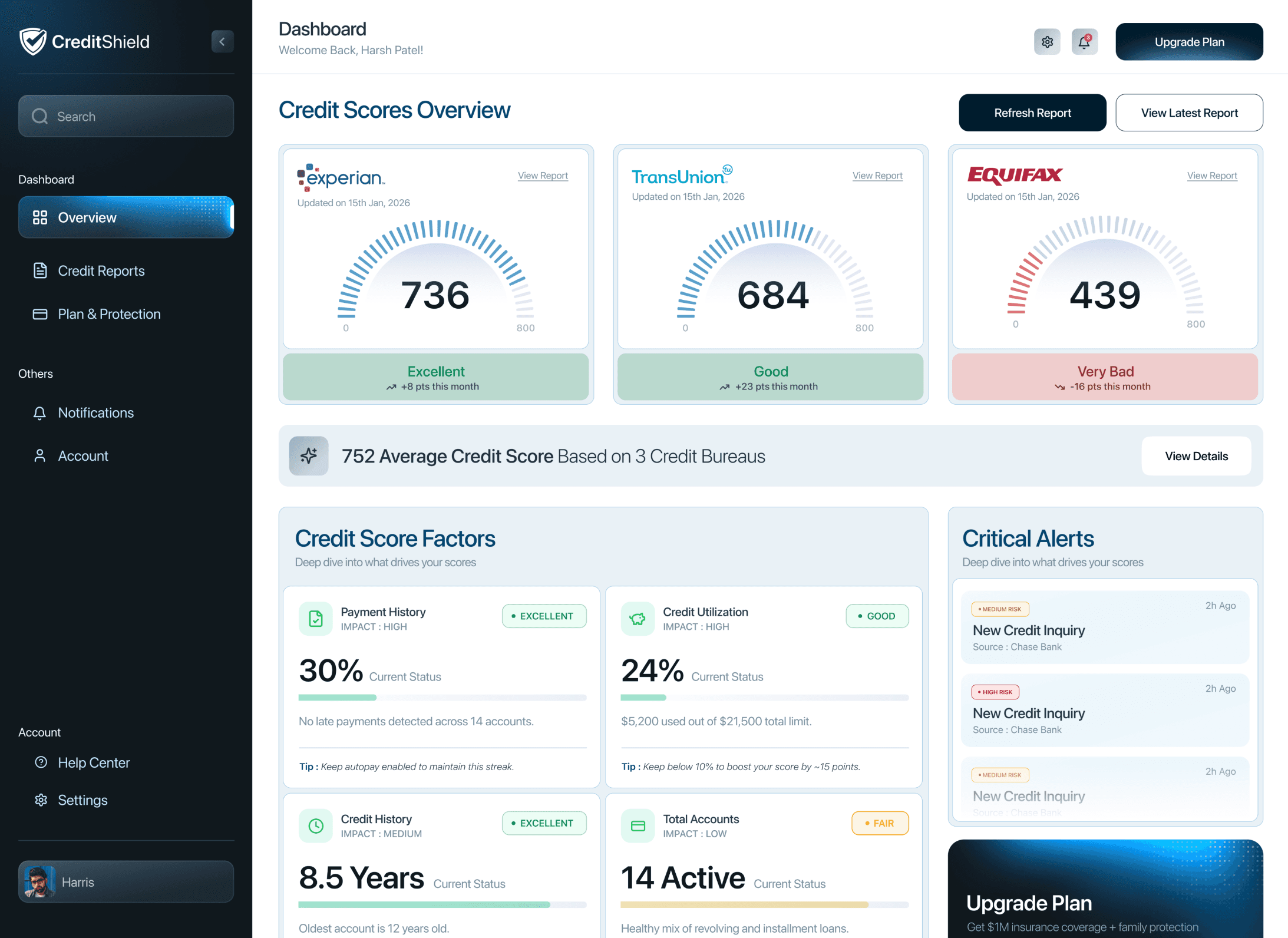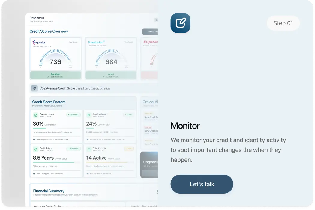 Credit Shield monitors your credit activity in real time, alerts you to important changes, and helps guide you through improving and protecting your credit profile.