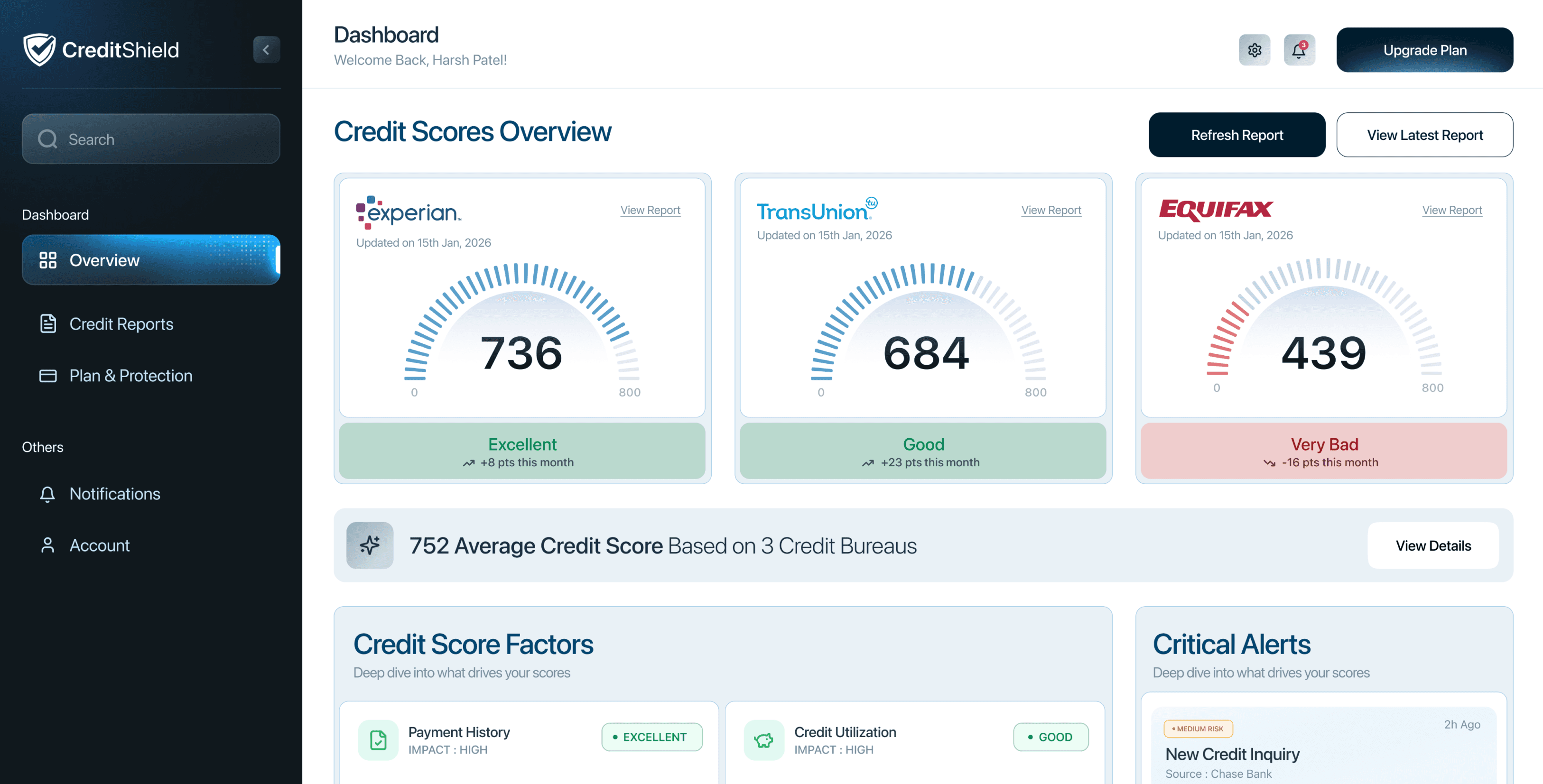 Credit Shield brings everything together in one place, giving you a complete view of your credit profile across all major bureaus. From score updates to detailed insights and alerts, every feature is designed to help you stay informed and in control.